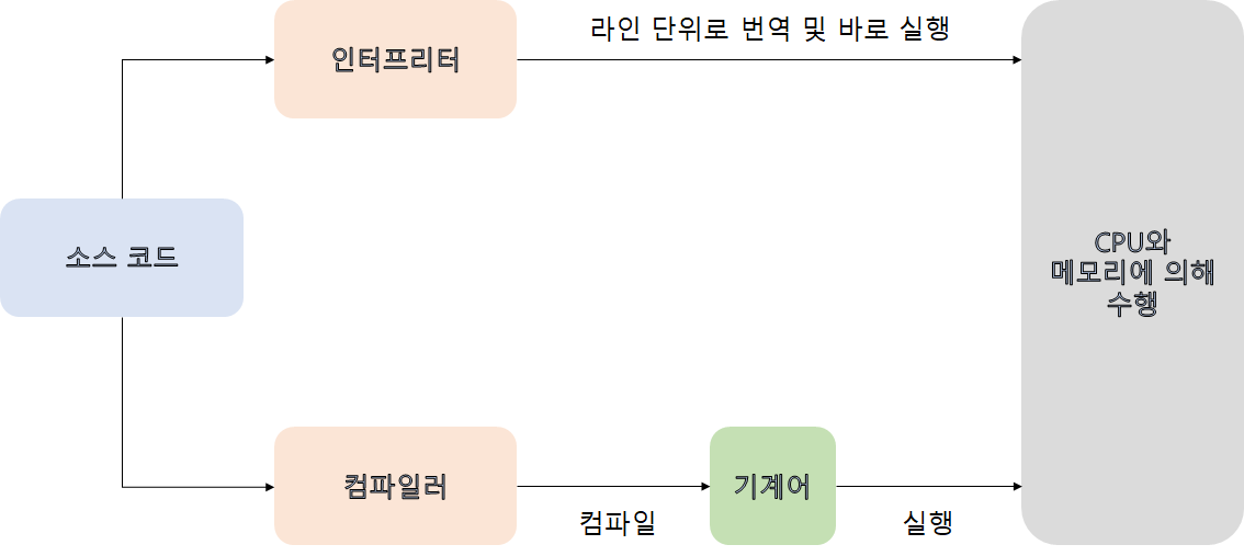 | 컴파일러 (Compiler) | 인터프리터 (Interpreter) | |